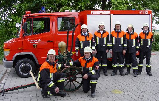 Der Kommandant, Gerätewart und die Maschinisten mit der alten Spritze aus