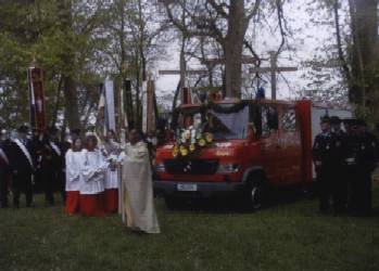 So stand am Sonntag den 28. April 2002 die Fahrzeugweihe an der Reihe und man begann nach dem Empfang der Ortsvereine und der FFW Hohenried um 8.30 Uhr mit einem Weißwurstfrühschoppen. Um 10.00 Uhr zelebrierte Pfarrer James Purathail den Festgottesdienst in der