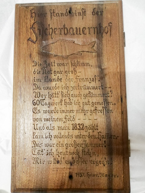 Hier stand einst der Fischerbauernhof Die Zeit war schlimm, die Not gar groß im Lande der Franzoß! Da wurde ich zertrümmert Wer hätt sich auch gekümmert? 60 Tagwerk hab ich gut gemessen von meinem Feld Und als man 1832 zählt kam ich vollends unter den Hammer Das war ein großer Jammer! Tät ich heut noch steh'n Mir würde es besser ergeh'n 1937. Heinr. Mayer