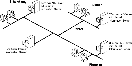 In einem größeren Unternehmen mit mehreren Abteilungen oder Arbeitsgruppen könnte Internet Information Server dagegen in jeder Abteilung auf einem bestehenden Datei-Server für arbeitsgruppenspezifische Informationen ausgeführt werden. Ein zentraler Informations-Server ließe sich für unternehmensweite Informationen, wie beispielsweise ein Personal- oder Firmenverzeichnis, einsetzen.